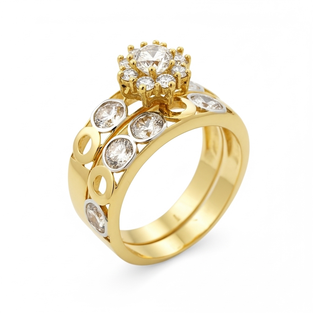 This is an exquisite 18K gold ring, likely made in Fes, which is a significant piece in Amazigh Moroccan culture, often used for engagements and weddings. The ring has a striking two-part design. The central piece is a square cluster of high-quality stones, and the band is split on each side with additional stones, giving the ring a substantial and luxurious appearance.